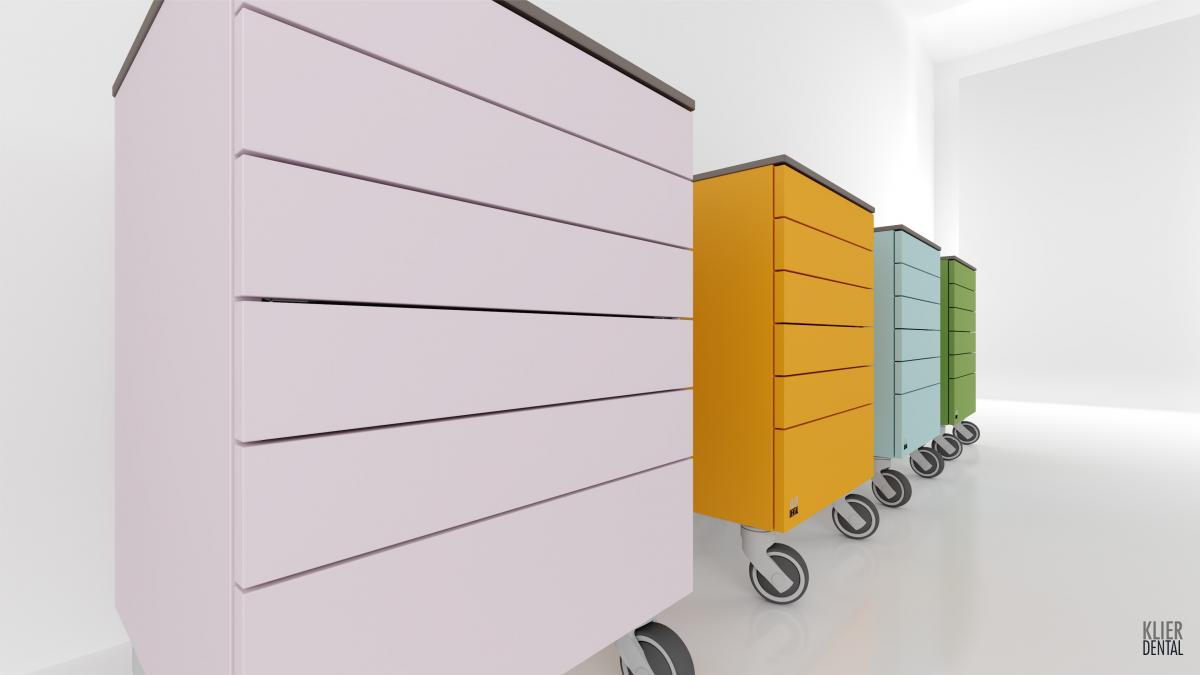 Dental mobile assistant TERRA tip-on handleless. The assistant has Legrabox drawers with full extensions and tip-on extension technology. This is a mechanical handleless opening method from Blum. The handle-less fronts open as if by themselves - you only need to press them lightly. To close it, you just need to press the front slightly. There is an option to choose five or six drawers. The worktop is made of a compact board with a thickness of 12 mm with a groove that prevents the tools from falling. TENTE wheels ensure smooth handling and can be locked in any position. The wheels have a brake and a load capacity of 400 kg. Drawer dental inserts suitable for the TERRA assistant are from group 1. The assistant can be produced in a wide range of designs and colors, you can choose from our sample book.